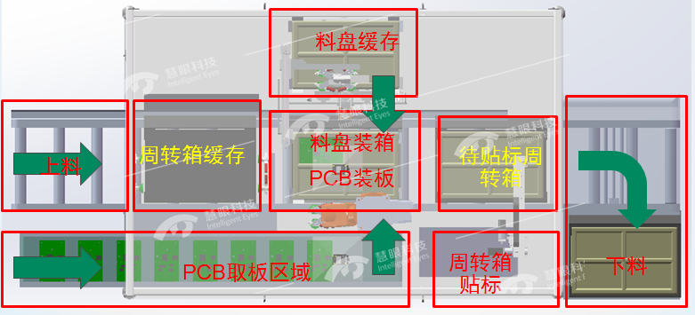 同时定位产品及纸箱每个料槽,达到精准定位抓取及放料装箱后自动贴标。